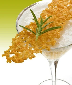 - Garnish with the Manchego tuile across the top of the glass and a sprig of fresh rosemary.